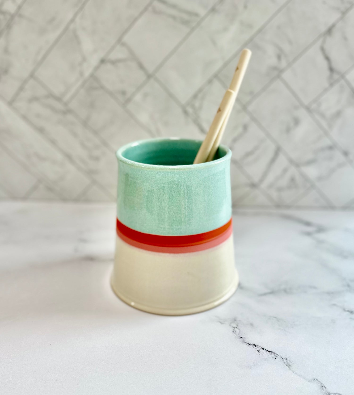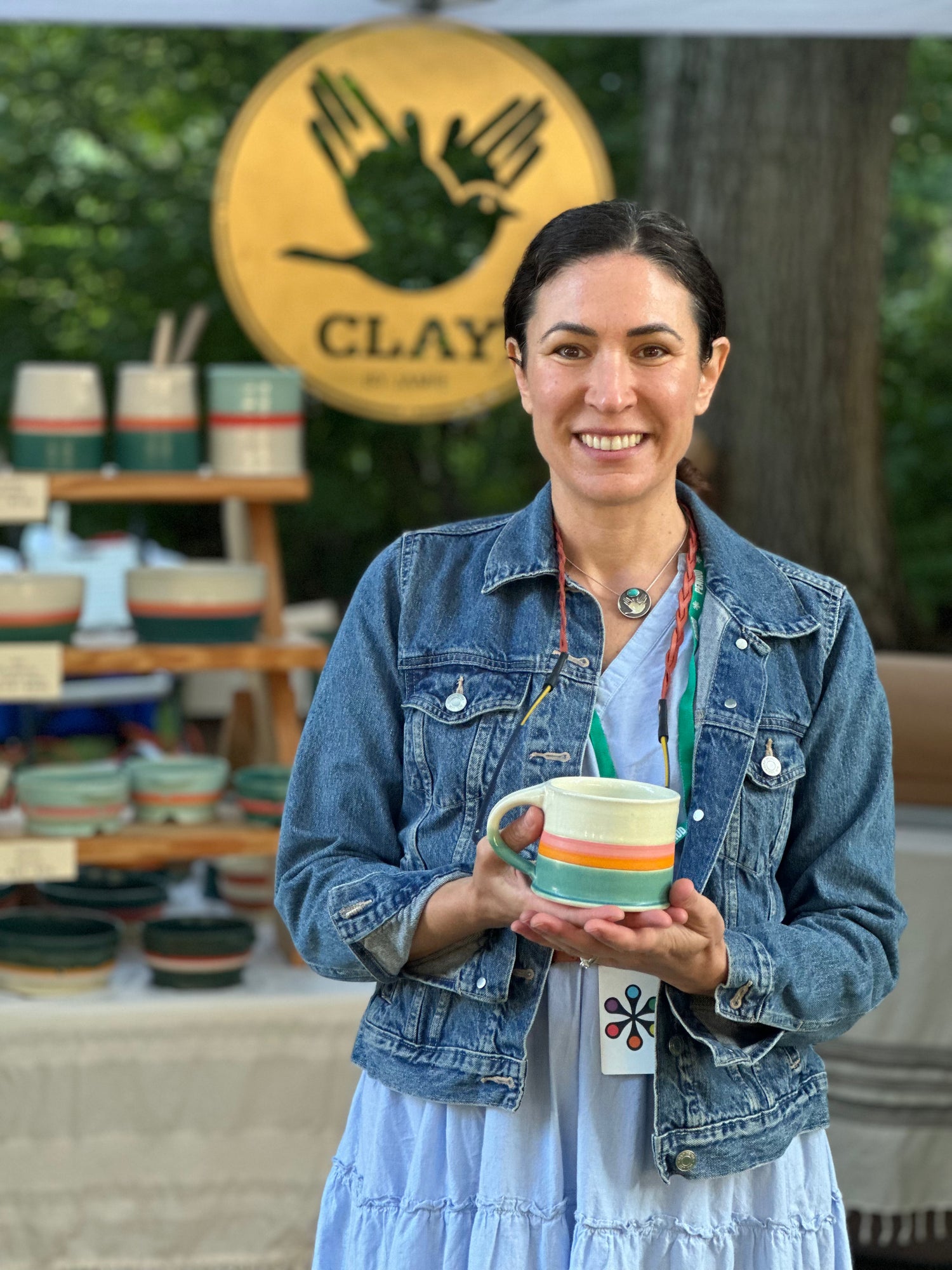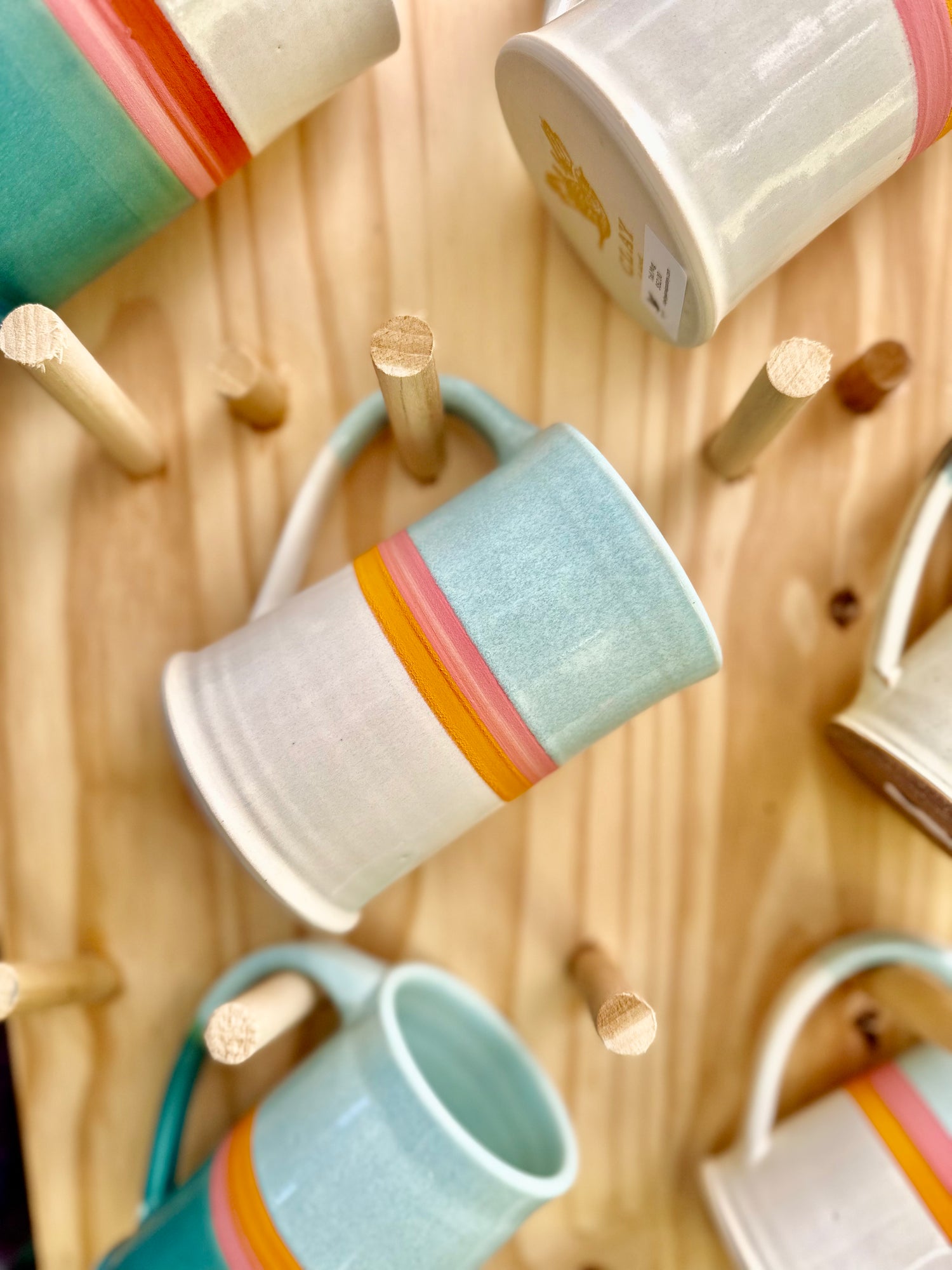 Each piece starts on the potter’s wheel and is finished with layers of vibrant underglaze and glaze to create colorful, painterly surfaces. I fire my work to cone 6 oxidation using both white stoneware and red clay bodies—this contrast allows for rich tonal variation and visual depth across collections.