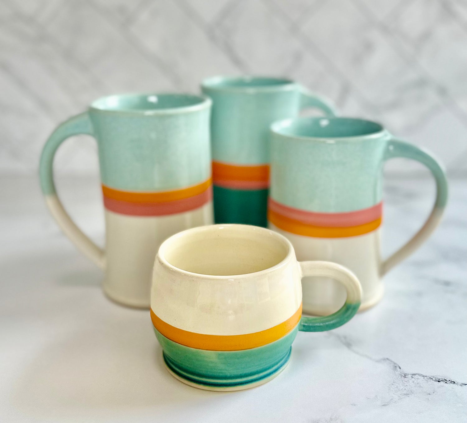Each piece starts on the potter’s wheel and is finished with layers of vibrant underglaze and glaze to create colorful, painterly surfaces. I fire my work to cone 6 oxidation using both white stoneware and red clay bodies—this contrast allows for rich tonal variation and visual depth across collections.